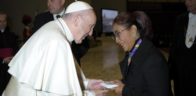 Pertemuan berlangsung Rabu sore (12/12) waktu setempat usai Paus berpidato di hadapan ribuan umat Katolik yang memadati Basilica Santo Petrus di Vatican City. Dalam kesempatan langka itu, Susi diberikan sebuah medali kenang-kenangan.