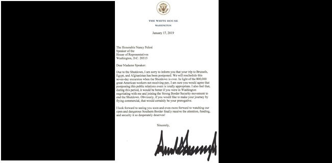 Lewat sepucuk surat pada kemarin (Kamis, 17/1), Trump mengatakan bahwa rencana lawatan Pelosi ke 3 Negara yaitu Brussels, Mesir dan Afghanistan, dibatalkan oleh Gedung Putih, dengan alasan bahwa saat ini masih berlangsung penutupan layanan pemerintahan atau