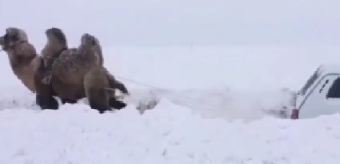 Pada upaya ketiga, mobil berhasil ditarik oleh unta dan suara-suara bersorak terdengar sebagai latar belakang video setelah mobil berhasil keluar dari tumpukan salju.