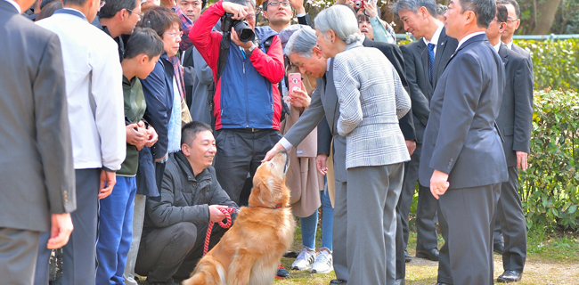 Bahkan, Kaisar Akihito mengelus seekor anjing Golden Retriever yang dibawa pengunjung taman.