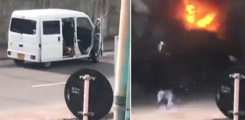 Cuplikan dari rekaman video yang beredar menunjukkan sebuah van putih diparkir di tengah jalan, sebelum tiba-tiba meledak.