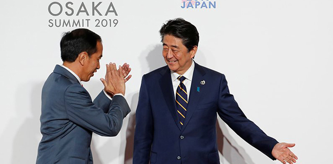 Perdana Menteri Jepang Shinzo Abe mengadakan pembicaraan dengan Presiden RI Joko Widodo disela-sela foto bersama pada pertemuan KTT G20 Osaka, Jepang, Jumat kemarin (28/6).
