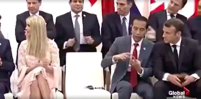 Juga ada foto di saat Jokowi duduk diapit Macron dan Trump. Jokowi terlihat berbisik-bisik dengan Trump. Tidak dijelaskan apa yang dibicarakan mereka sambil berbisik-bisik. Apakah sesuatu yang yang penting, atau sekadar basa-basi.