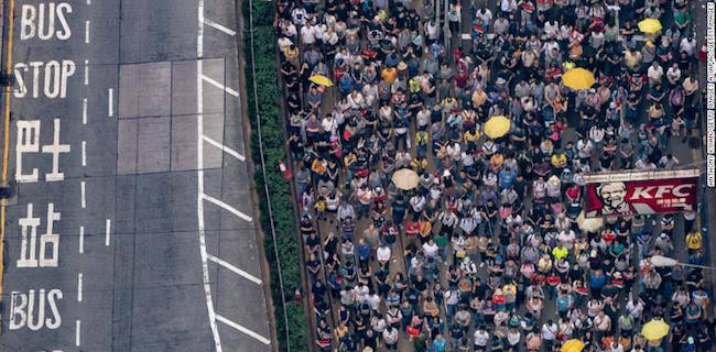 The Guardian, demonstran mengabaikan tuntutan polisi untuk mengakhiri aksi sebelum mencapai wilayah jantung distrik bisnis di Hong Kong. Demonstran terus bergerak maju bahkan hingga ke dekat kantor penghubung Hong Kong-China.