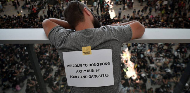 "Selamatkan Hong Kong dari tirani dan kebrutalan polisi," tulis salah satu tanda di selembar karton.