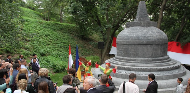 Persisnya, replika Stupa Borobudur dengan ukuran yang sama dengan stupa aslinya yang dibangun oleh KBRI Kyiv di Kebun Raya Nasional M.M. Gryshko, Kyiv, ibu kota Ukraina.