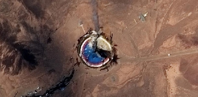 launchpad Iran pekan kemarin. Di sekelilingnya ada tampak seperti sisa-sisa roket yang hangus dan landasan.