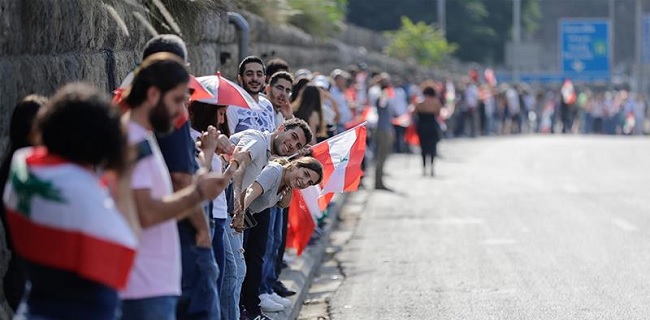Mereka bergandengan tangan dari wilayah Tripoli hingga ke wilayah Tyre. Rantai manusia yang dimbuat itu mencapai sepanjang 170 kilometer yang melintasi pusat protes utama di ibukota, Beirut.