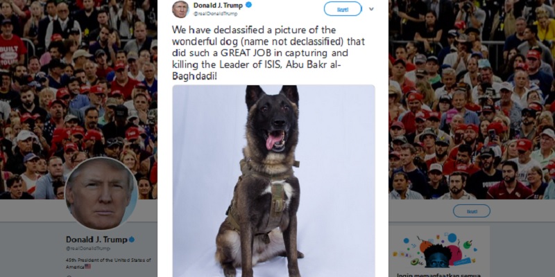 "Kami telah mendeklasifikasi gambar anjing yang indah (nama tidak diklasifikasikan) yang melakukan pekerjaan besar dalam menangkap dan membunuh Pemimpin ISIS, Abu Bakr al-Baghdadi," tulis Trump di akun Twitternya pada Senin sore (28/10).