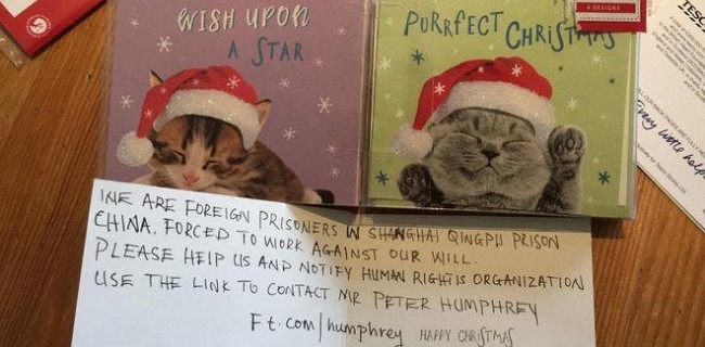 "Kami adalah tahanan asing di Penjara Qingpu Sanghai China. Dipaksa untuk bekerja di luar kehendak kami. Tolong kami dan beritahu organisasi kemanusiaan. Gunakan link ini untuk menghubungi Mr. Peter Humphrey," tulis para tahanan yang mengaku mengemas Kartu Natal tersebut sembari menyertakan tautan, seperti dimuat