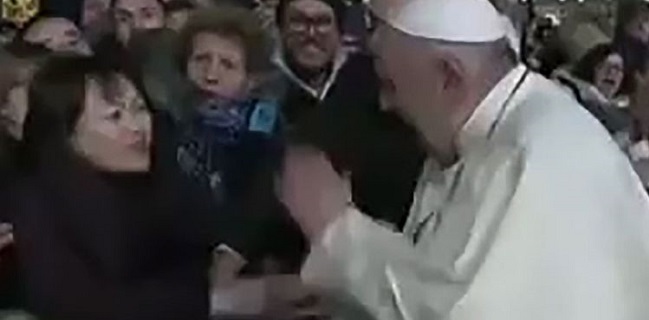 Kemudian, seorang wanita membuat tanda salib lalu meneriakkan sesuatu sembari menarik tangan Paus hingga hampir terjatuh. Paus yang tampaknya meringis kesakitan kemudian secara refleks menampar tangan wanita tersebut.