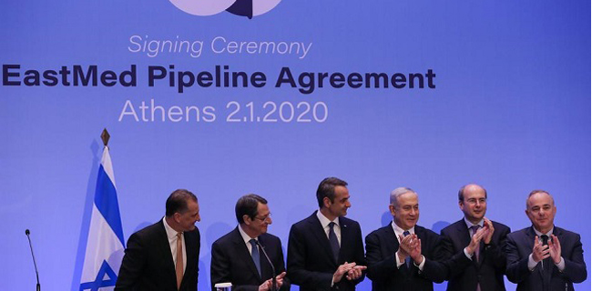 Di Ibukota Yunani, Athena, pada Kamis (2/1), Perdana Menteri Israel Benjamin Netanyahu, Perdana Menteri Yunani Kyriakos Mitsotakis, dan pemimpin Siprus-Yunani, Nicos Anastasiades menyaksikan penandatanganan proyek pipa "EastMed Pipeline" untuk mengirimkan gas alam, utamnya hidrokarbon dari Mediterania timur ke Eropa.