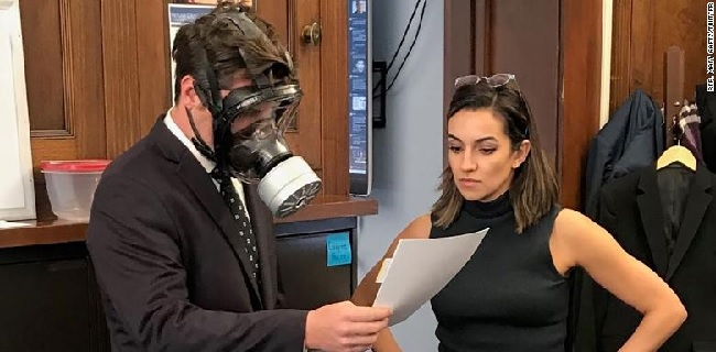 Politisi Partai Republik itu mengenakan masker gas pada sebuah sesi di DPR pada hari Rabu (4/3) saat memberikan suara pada sebuah rancangan undang-undang yang akan mendedikasikan miliaran dolar untuk memerangi virus corona karena kekhawatiran tentang penyebaran virus tersebut.