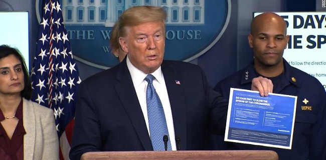 Dengan alasan itu, Trump mendesak agar orang-orang untuk tidak melakukan pertemuan yang melibatkan lebih dari 10 orang untuk menghindari penyebarluasan wabah.
