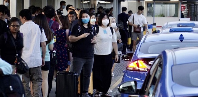 Di luar Woodlands Checkpoint di Singapura, mereka yang menyeberang berusaha naik bus umum atau menunggu di pinggir jalan.