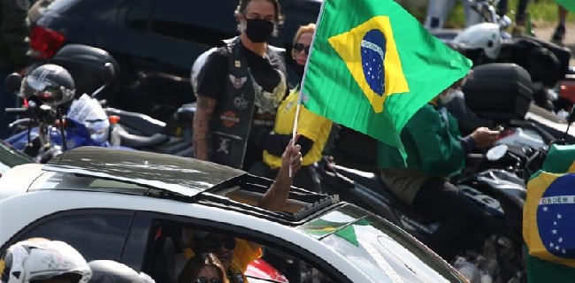 Para pengunjuk rasa turun ke jalan dengan menumpang truk, mobil dan motor. Beberapa di antara mereka membawa serta bendera nasional Brasil.
