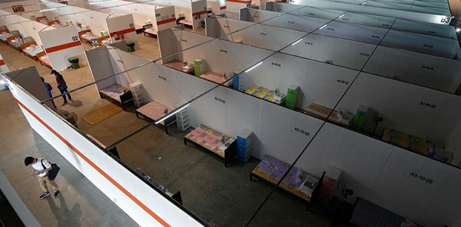 Pada Sabtu (25/4), para pasien telah dipindahkan. Di mana dalam satu ruang konferensi yang luas, terdapat 8 hingga 10 orang dengan tempat tidur, laci penyimpanan, hingga kipas. Setiap kamar disekat.