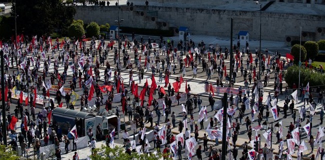 Ratusan pengunjuk rasa yang tergabung dalam kelompok PAME, mengenakan masker dan sarung tangan. Mereka berkumpul di luar gedung parlemen pada Jumat (1/5).