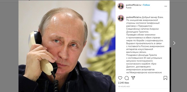 "Selamat malam semuanya. Atas prakarsa pihak Amerika, percakapan telepon dilakukan dengan Presiden Amerika Serikat, Donald Trump. Pertukaran pandangan diadakan pada langkah-langkah yang diambil kedua negara untuk memerangi virus corona," tulis Putin.