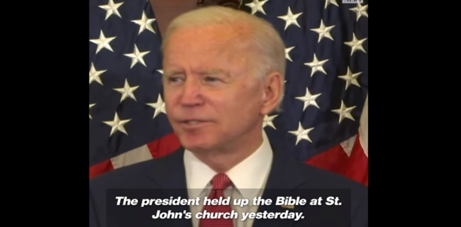 “Presiden mengangkat Alkitab di Gereja St John kemarin. Saya berharap dia membukanya sebentar, daripada hanya mengacungkannya saja. Jika dia membukanya dia bisa belajar sesuatu. Mereka semua dipanggil untuk saling mencintai sebagaimana kita mencintai diri kita sendiri. Itu memang kerja keras, tapi itulah tugas orang Amerika," kata Biden. Ia menduga Trump tidak tertarik melakukan pekerjaan itu.