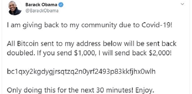 "Semua Bitcon yang dikirimkan ke akun saya di bawah akan dikirim kembali dua kali lipat. Jika Anda mengirimkan 1.000 dolar AS, saya akan mengirim kembali 2.000 dolar AS," cuit akun @BarackObama pada Rabu (15/7).