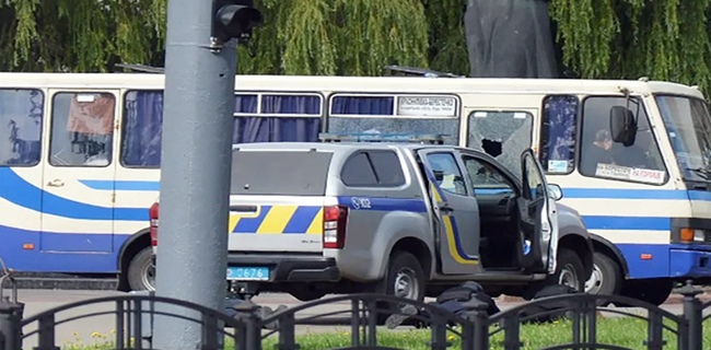 Pihak kepolisian menutup pusat kota Lutsk, sekitar 400 kilometer dari ibu kota Kiev, dan meminta penduduk untuk tidak meninggalkan rumah atau tempat kerja mereka. Mereka mengatakan layanan keamanan SBU, yang memerangi terorisme dan terlibat dalam kontra intelijen telah mengepung bus setelah dua tembakan dilepaskan dari sana.