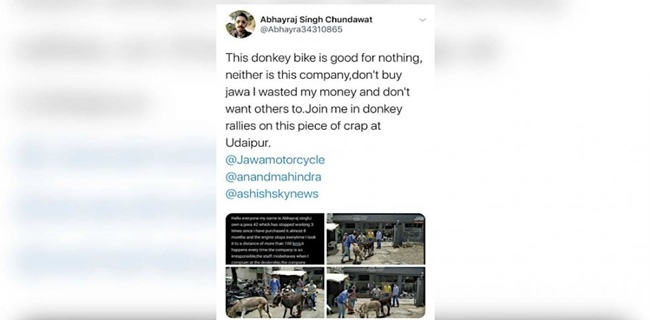 "Motor keledai ini tak bagus dalam hal apa pun, begitu juga pembuatnya. Jangan beli Jawa, saya membuang uang saya dan tak ingin ada orang yang melakukan hal serupa. Ayo, bergabung dengan protes terhadap sampah ini di Udaipur," tulisnya melalui Twitter, seperti dikutip dari