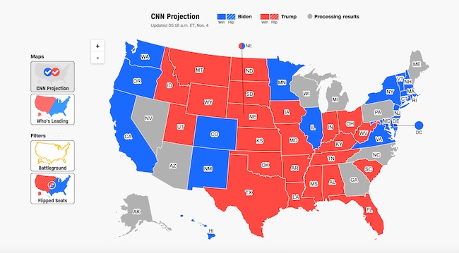 CNN.com, sembilan negara bagian masih melakukan penghitungan suara. Kesembilan negara bagian itu adalah Georgia, North Carolina, Pennsylvania, Maine, Michigan, Wisconsin, Nevada, Arizona, dan Alaska.