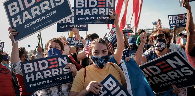 Berkumpul di pusat kota, para pendukung Biden-Harris merayakan kemenangan pasangan pilihan, seperti dilaporkan