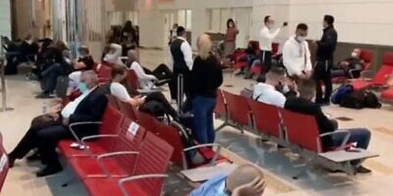 Dalam video yang diunggah oleh media tersebut terlihat para penumpang yang tampak kelehan menunggu di kursi tunggu bandara.