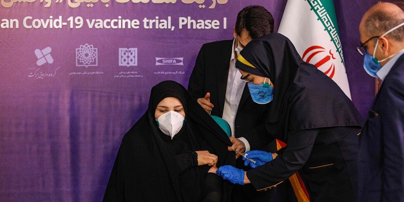 Associated Press, tiga sukarelawan yang menerima suntikan pertama dalam sebuah upacara di sebuah hotel di Teheran. Sejauh ini, belum ada sukarelawan yang mengalami efek samping seperti demam atau kejang.