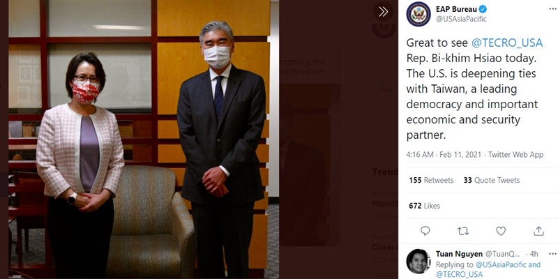 Duta besar Taiwan di Washington, Hsiao Bi-khim, mengatakan dia telah bertemu dengan Sung Kim, penjabat Asisten Menteri Luar Negeri AS untuk Urusan Asia Timur dan Pasifik/Repro