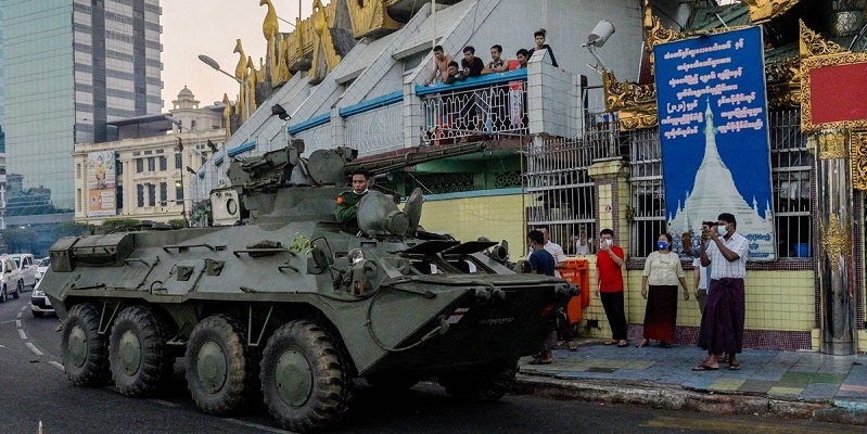 Pada Minggu malam (14/2), kendaraan lapis baja muncul di Yangon, Myitkyina dan Sittwe. Itu adalah pengerahan kendaraan militer skala besar yang dilakukan sejak kudeta pada 1 Februari.