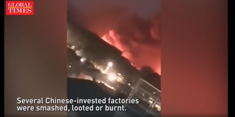 Serangan terhadap pabrik-pabrik China diduga karena China dipandang mendukung junta militer yang telah mengambil alih kekuasaan. Halaman Facebook kedutaan China dibombardir dengan komentar negatif dalam bahasa Myanmar dan lebih dari setengah reaksi - lebih dari 29.000 - menggunakan emoji wajah tertawa.