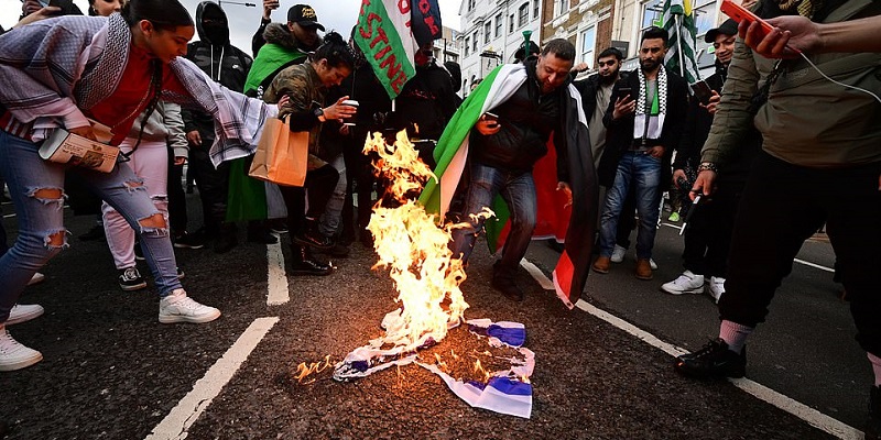 Daily Mail, aksi pembakaran bendera Israel dilakukan di luar Kedutaan Israel di London.