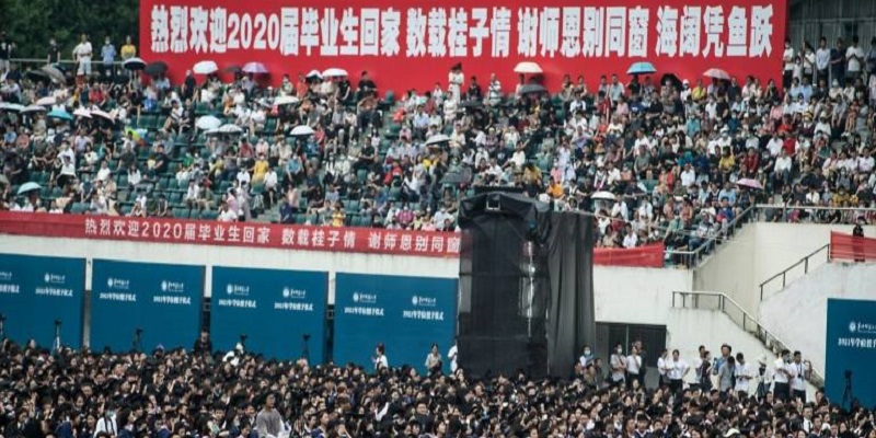 Upacara wisuda yang digelar oleh Universitas Wuhan itu dilakukan pada Minggu (13/6). Tampak wisudawan mengenakan seragam kelulusan berwarna biru tua. Hampir seluruhnya tidak mengenakan masker atau menjaga jarak.