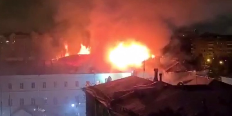 Rekaman dari tempat kejadian yang dibagikan secara online menunjukkan api melahap atap gedung saat asap tebal mengepul dari lokasi.