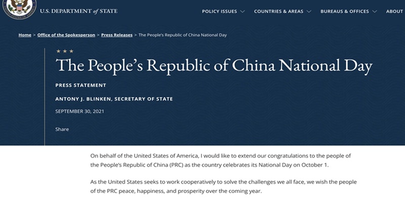 Tangkapan layar yang diambil dari laman situs resmi Departemen Luar Negeri AS pada 1 Oktober 2021, menunjukkan pernyataan pers Menteri Luar Negeri AS Antony Blinke yang mengucapkan selamat untuk hari jadi China/Net