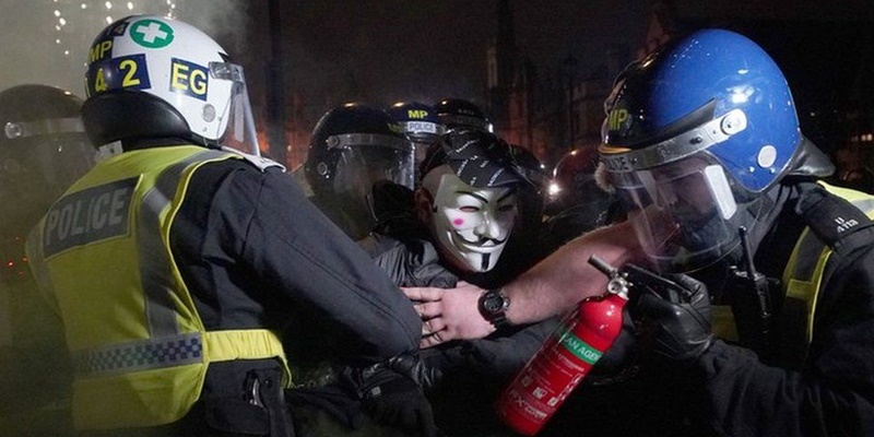 Protes The Million Mask March di Malam Api Unggun, berubah menjadi kekacauan ketika pengunjuk rasa tidak bersedia dibubarkan petugas. Mereka menentang pembatasan penguncian Covid, yang sepenuhnya telah dicabut beberapa bulan lalu, sementara yang lain meneriakkan retorika anti-vaksinasi.