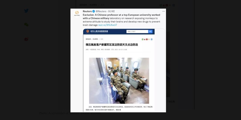 Dikatakan dalam laporan tersebut bahwa peneliti mengekspos monyet ke ketinggian ekstrim untuk mempelajari otak mereka dan mengembangkan obat baru untuk mencegah kerusakan otak. Tweet itu diposting di samping foto tentara China di ruang oksigen yang tidak ada hubungannya dengan konten tweet.