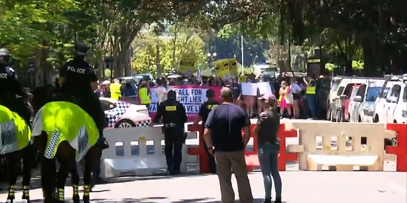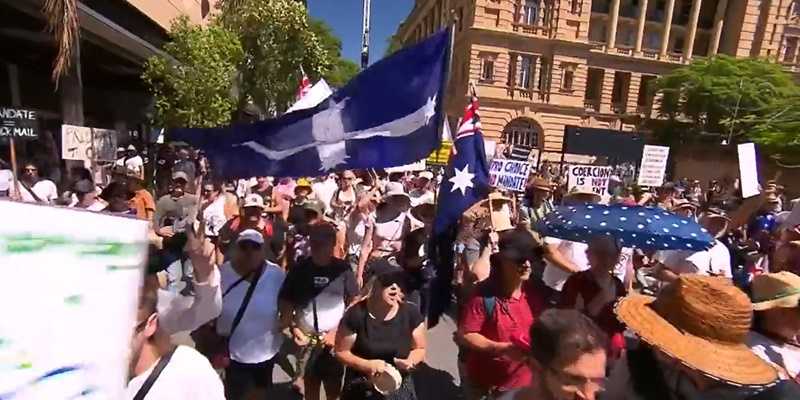 Sementara di Queensland para pengunjuk rasa berbondong-bondong memadati jalan-jalan menuju kota. Ada juga rapat umum anti-vaksinasi di Brisbane, ketika para pengunjuk rasa bertemu di CBD untuk berjalan menuju parlemen. Pemimpin Partai Bersatu Australia, Clive Palmer, menghadiri protes di Brisbane.