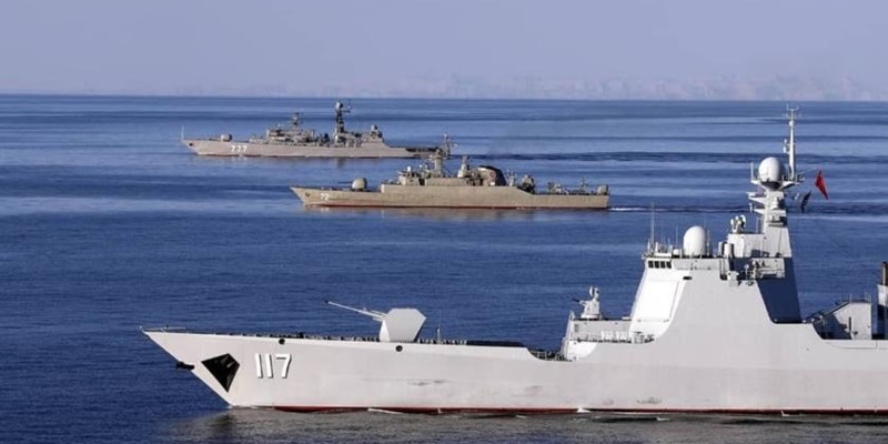 Kapal perusak Tipe 052D Angkatan Laut Tentara Pembebasan Rakyat China, fregat Angkatan Laut Republik Iran ALBORZ (72), dan Angkatan Laut Rusia. Fregat kelas Neustrashimyy Yaroslav Mudry selama latihan angkatan laut bersama Iran-Rusia-China di Samudra Hindia dan Teluk Oman/Net