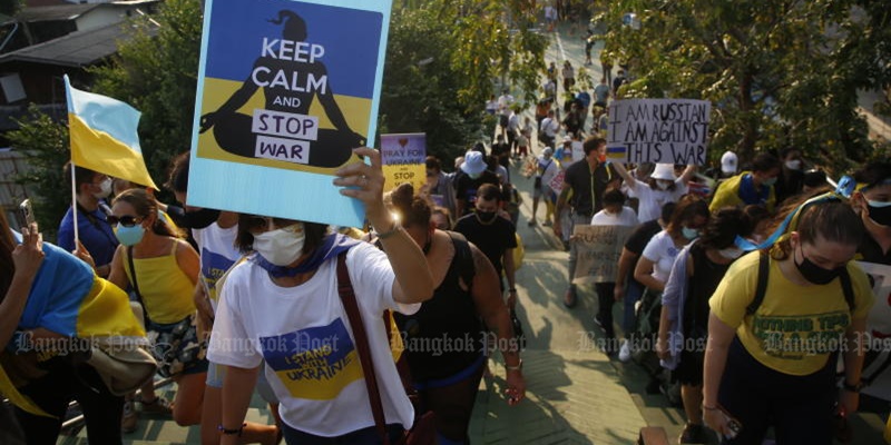 Sekitar 50 pengunjuk rasa yang terdiri dari warga Ukraina, Rusia, Belarusia, Thailand, dan warga negara lainnya, berbaris membawa plakat menyerukan agar tentara Rusia menghentikan perang dan segera meninggalkan Ukraina.