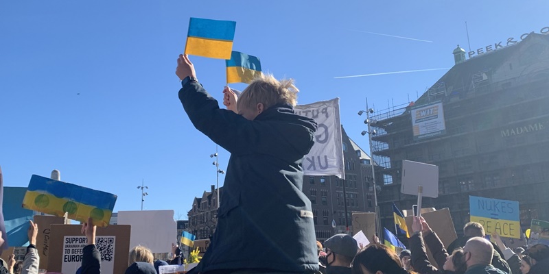 Seorang peserta bernama Katya Diks berdiri terbungkus bendera Ukraina, tersenyum ketika dia melihat seorang gadis kecil bergabung dengan nyanyian dari bahu ayahnya. Diks, yang pindah dari Ukraina ke Belanda lebih dari 20 tahun yang lalu mengaku masih memiliki teman dan keluarga di Kiev dan kota-kota lain yang selalu ada di pikirannya. Baginya, protes tersebut merupakan saluran yang disambut baik untuk mengambil tindakan.