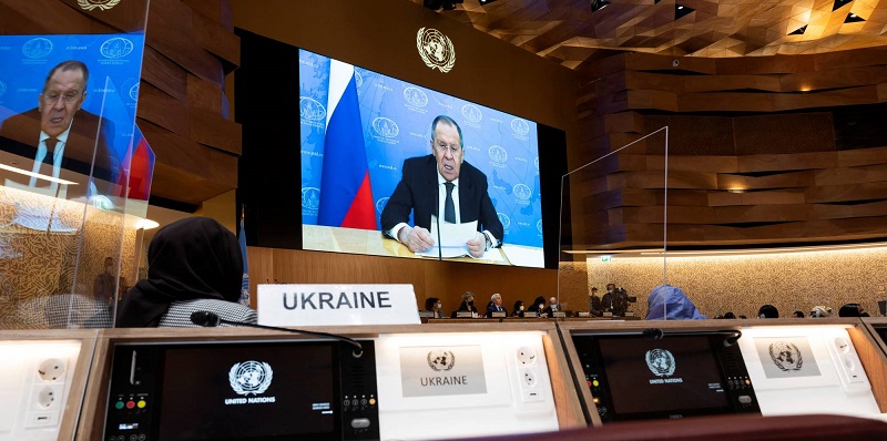 Selama pidato video Lavrov di hadapan Dewan Hak Asasi Manusia di Jenewa pada Selasa, puluhan pejabat keluar untuk memprotes invasi Rusia ke Ukraina, termasuk dari Inggris, AS dan Uni Eropa.