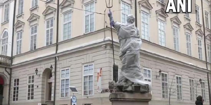 Empat patung di sekitar alun-alun Rynok di Liev ditutupi, termasuk "Patung Neptunus" yang dianggap sebagai pelindung laut.