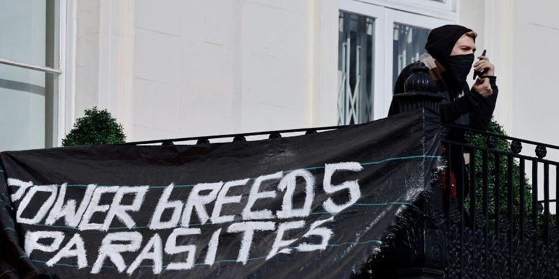 Pengunjuk rasa membentangkan spanduk di dinding dan pagar rumah di 5 Belgrave Square. Salah satu spanduk bertuliskan "Properti ini telah dibebaskan" yang dipasang berdampingan dengan bendera Ukraina.