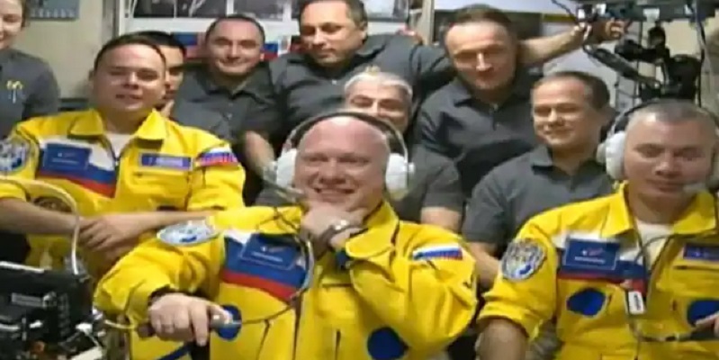 Tiga kosmonot Rusia tiba di ISS dengan mengenakan setelan kuning dan biru, warna yang mirip dengan bendera Ukraina, pada Jumat (18/3).