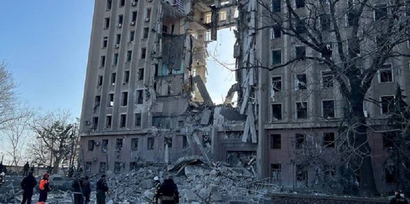 Gubernur setempat, Vitaliy Kim mengatakan Rusia meluncurkan serangan jebat dengan menghancurkan setengah bangunan, termasuk kantor gubernur.