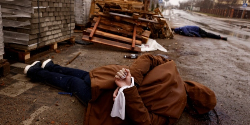 Pihak berwenang Ukraina melaporkan puluhan warga sipil tewas ditemukan di Bucha, barat laut Kiev, setelah pasukan Rusia meninggalkan daerah itu. Gambar yang diambil oleh berbagai sumber mendokumentasikan bagaimana beberapa orang mati dengan tangan diikat.